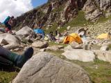 Tiutage ankaŭ estis grupo de novuloj, kiuj jam varapis siajn unuajn montojn ĉi-printempe ĉe Ĥibinoj kaj pro tio rajtis iri jam pli malfacilajn itinerojn. Tamen malgraŭ ke kategorioj de komplikeco inter la itineroj tie kaj ĉi tie egalis, fakte la itineroj kaŭkazaj estas pli malfacilaj. Pro tio tiuj genovuloj estis iom ŝokitaj, ke ili trapasis la itineron tiom longe. Ili eliris el nia tendareto je la 4-a matene kaj revenis nur je la 9-a vespere. Do, ambaŭ fojojn sensune.