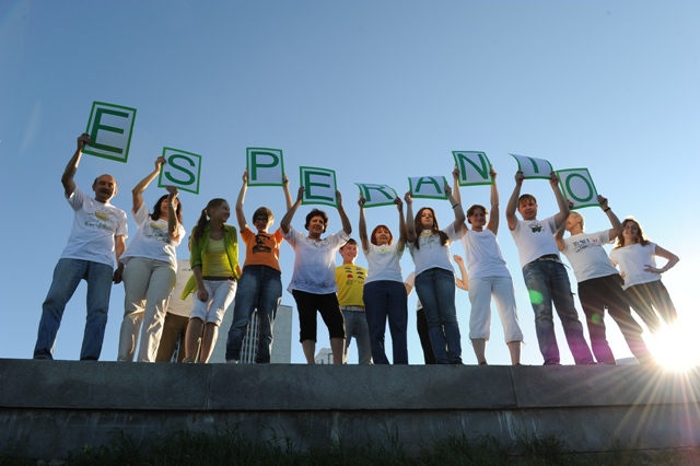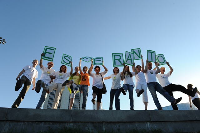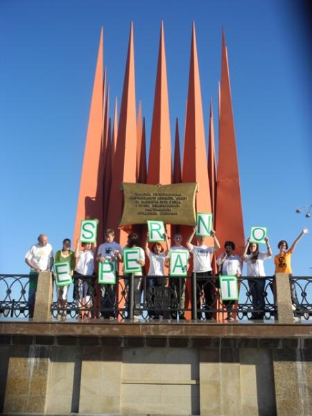 Post tri pluvaj tagoj, feliĉe la 1-an de aŭgusto denove estis bonega, suna vetero kaj nia esperantista grupo kolektiĝis ĉe la Domo de Paco kaj Amikeco. Multaj el ni estis vestitaj en T-ĉemizoj kun verdaj steloj, surskriboj “Esperanto’, “Lingva revolucio” k. t. p. Kunpreninte anticipe presitajn sufiĉe grandajn, por vidi de malproksime, naŭ literojn, ni vigle ekpaŝis en la urbocentron.