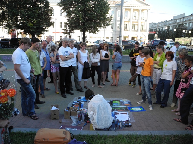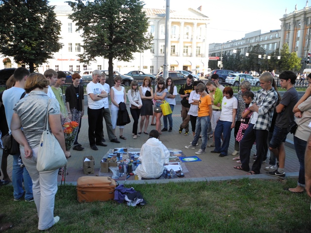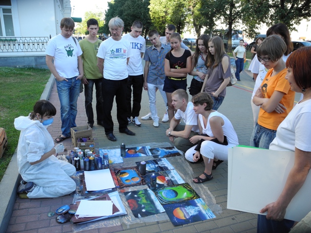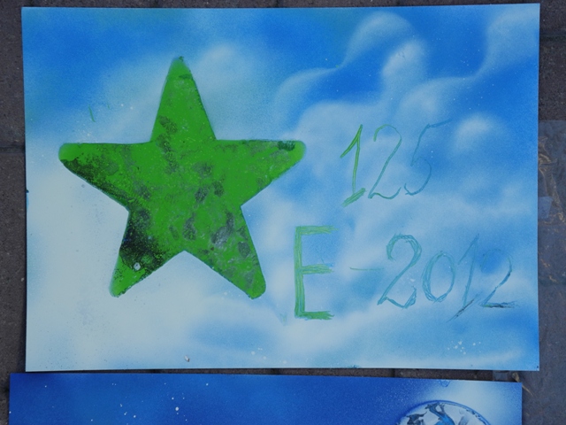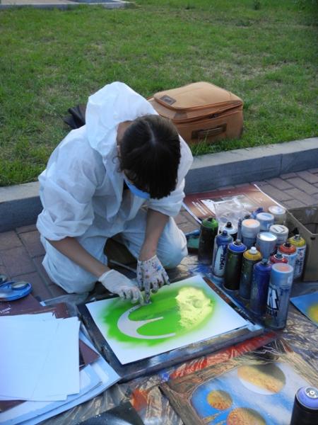 En la sama tago kaj tempo jekaterinburga komencanta esperantistino Julija Moĉalova refoje okazigis centre de la urbo la surstratan prezentadon pri aerografio. Ŝi, uzante diverskolorajn farboŝprucigilojn, je la okuloj de ĉeestanta publiko lerte pentris bildojn kun fantastikaj kosmaj kaj ekzotikaj naturaj pejzaĝoj. Sed ĉi-foje unu el la temoj de ŝiaj bildoj iĝis ankaŭ 125-jara Esperanto, tial sur ili aperis konataj E-simboloj kaj E-emblemo.