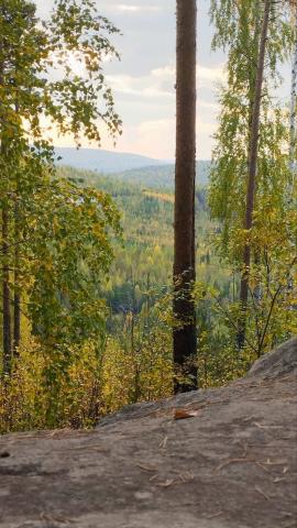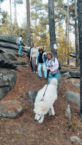 La celitan lokon ĝis la komenco de la arbaro, en kiu troviĝas Petrogrom, ni atingis per privataj aŭtoj, kiujn poste lasis ĉi tie kaj plu ekpaŝis piede. Estis agrabla suna tago, aŭtuno sukcesis jam bele kolorigi la arbaron, ni vigle moviĝis antaŭen, ĝuante mirindan aŭtunan belecon de la naturo. Laŭvoje ni devis trairi paron da marĉecaj lokoj, kie estis disĵetitaj arbotrunkoj por ke ilin pli facile eblus trapaŝi. Poste ĉiujn atendis longa supreniro al la monto, sur kies pinto komenciĝis rokĉeno Petrogrom.